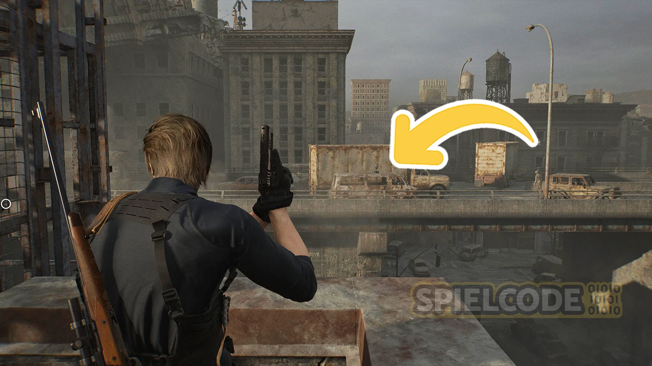 Wenn du den großen Stahlträger auf der großen Straße in Raccoon City Ost herunterlässt, um wieder in den westlichen Teil des Gebiets zurückkehren zu können, solltest du mitten auf dem Stahlträger kurz stehenbleiben.