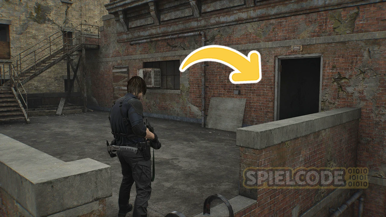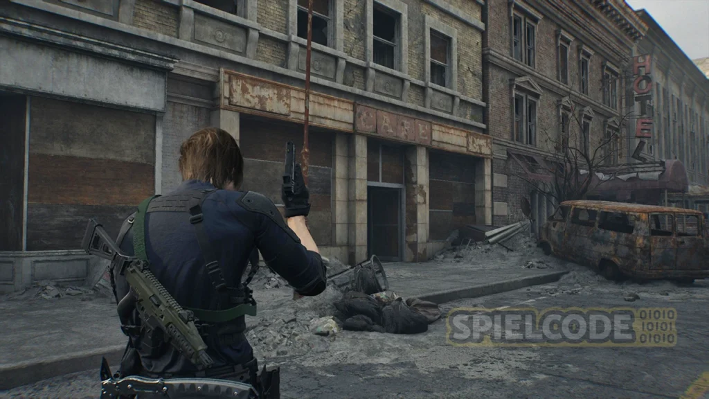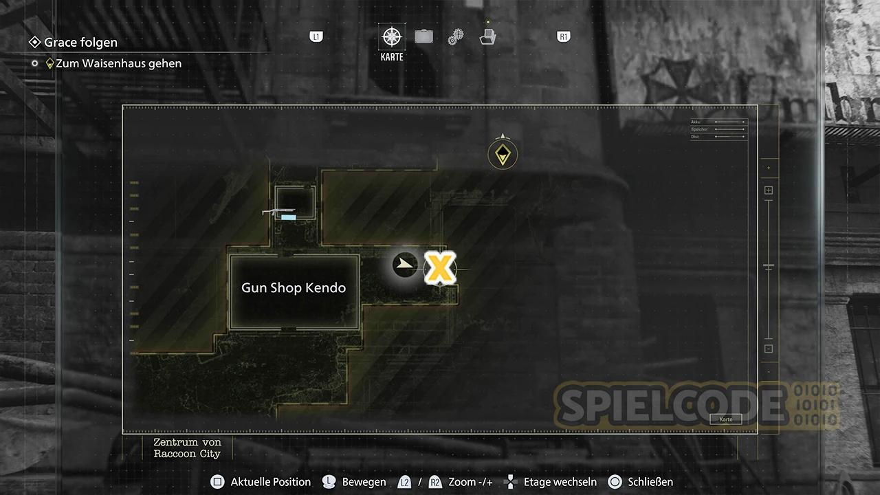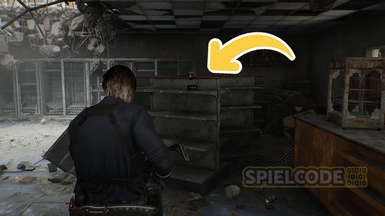 Im Zentrum von Raccoon City gibt es schließlich noch eine Figur und zwar im Gun Shop Kendo. Wenn du den Gunshop betreten und die Erinnerung gesehen hast, erlangst du wieder die Kontrolle über Leon. Jetzt solltest du nicht direkt nach draußen rennen. Drehe dich einmal um und laufe links den Gang nach draußen.