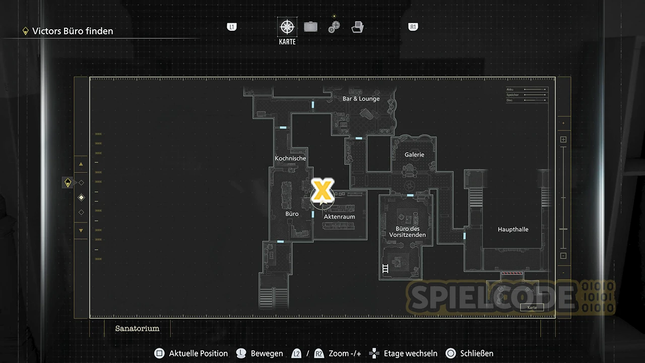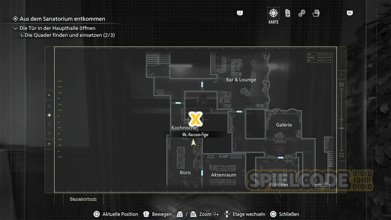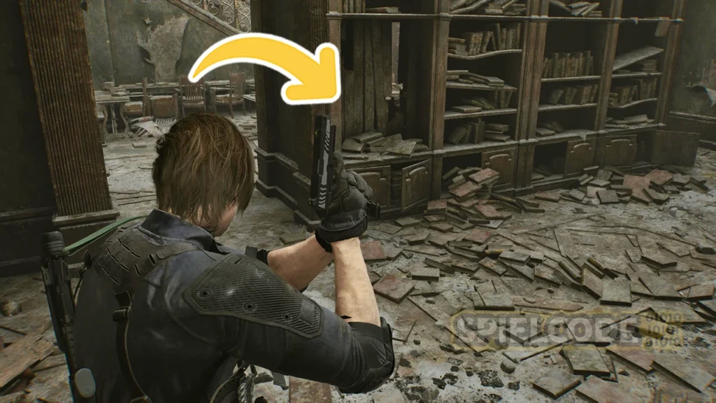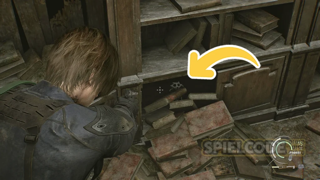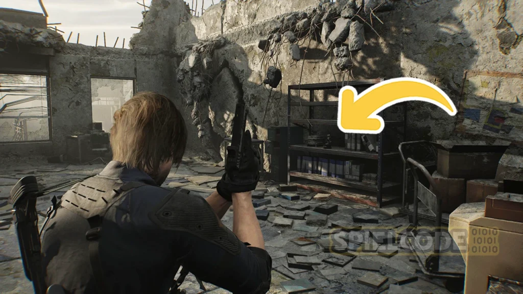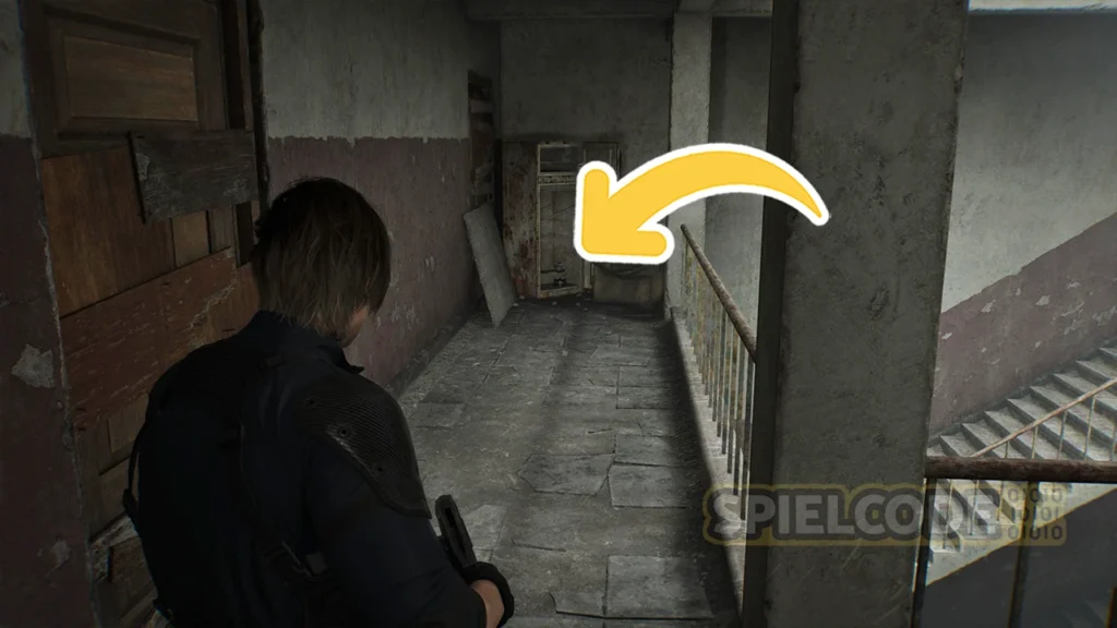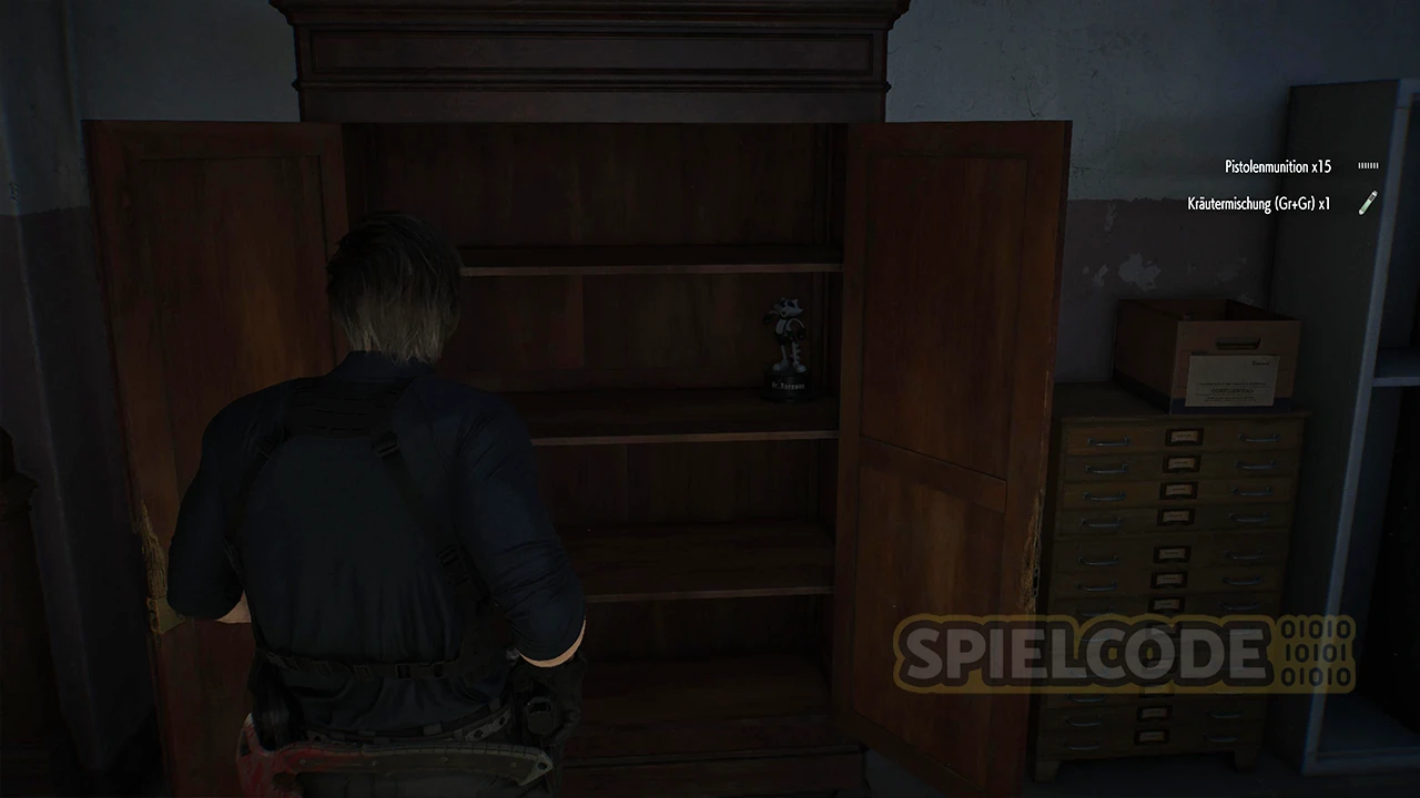 Wenn du mit Leon S. Kennedy zum Büro des Vorsitzenden läufst, kannst du seine Handaxt nutzen, um die großen braunen Schränke aufzustemmen. In einer dieser Schränke befindet sich eine Figur, und zwar im Aktenraum.