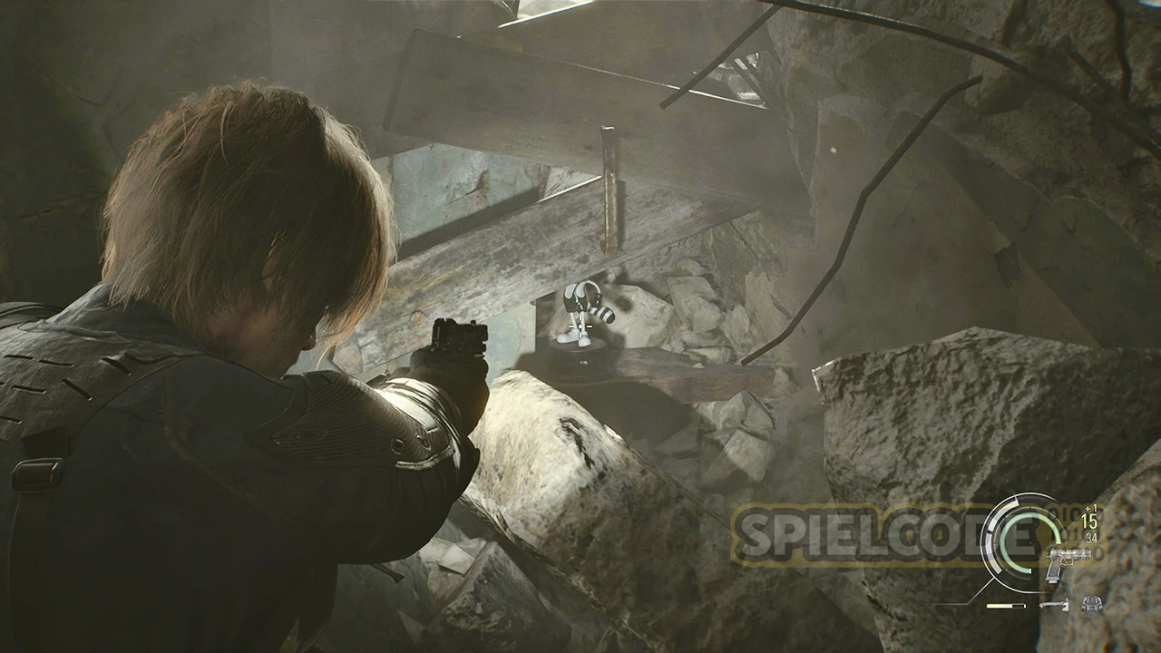 Diese Figur ist schon recht gut versteckt, will ich meinen. Wenn du die Kampfsequenz mit Leon absolvierst, bei der er Grace und Emily vom Dach aus beschützen sollst, musst du kurz vor der Treppe auf dem Dach, die nach oben führt, haltmachen.