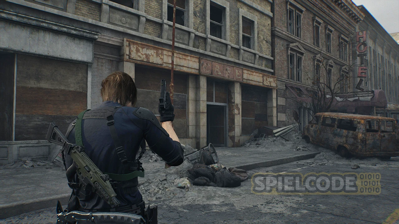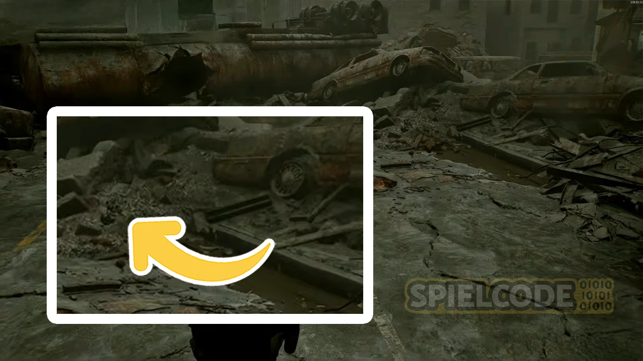 Nun machen wir einen Sprung ins Zentrum von Raccoon City. Direkt nach der haarsträubenden Motorradsequenz, die dich ins Zentrum von Raccoon City führt, solltest du dich gut umsehen. Denn direkt am Anfang in der Nähe des Bikes steht eine Figur in der Ecke bei den kaputten Autos und dem LKW mit dem Loch in der Mitte.