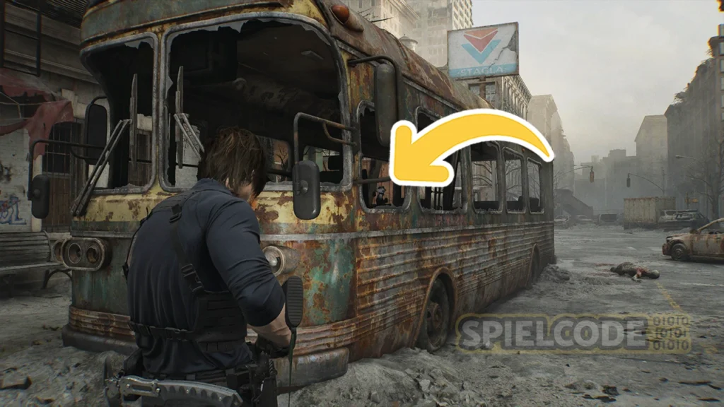 Jetzt kannst du dich frei auf der großen Straße bewegen, von Westen nach Osten, und du solltest einmal zum Großen Bus in der Mitte rennen. Hier sitzt ein Figur auf der Fahrerseite des kaputten Gefährts.