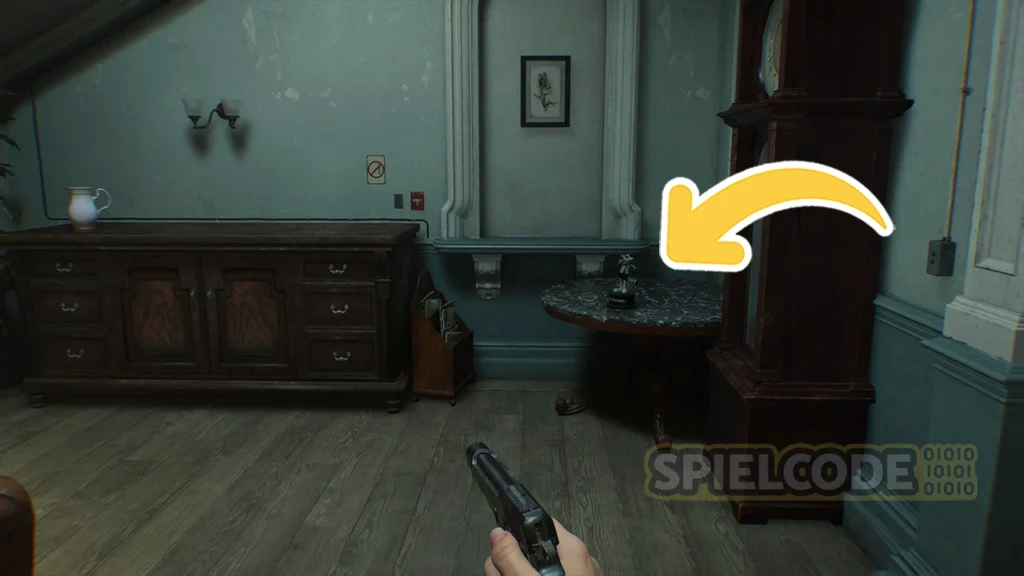 Ein Stück weiter geht es die Treppe hoch in das Obergeschoss. Hier musst du rechts gehen, um eine Figur auf dem Regal im Nebenraum anzutreffen.