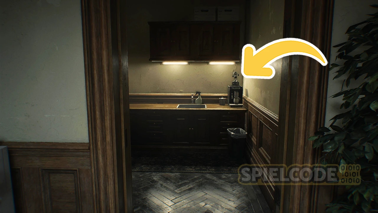 Und wenn wir schon beim Aktenraum sind: Eine weitere Figur gibt es in der Kochnische, die ein Teil des Büros (beim Aktenraum) ist. Nördlich des Büros gehst du straight forward auf die Kochnische zu. Dann siehst du den kleinen Racker auf der Kaffeemaschine stehen (er weiß, was gut ist).