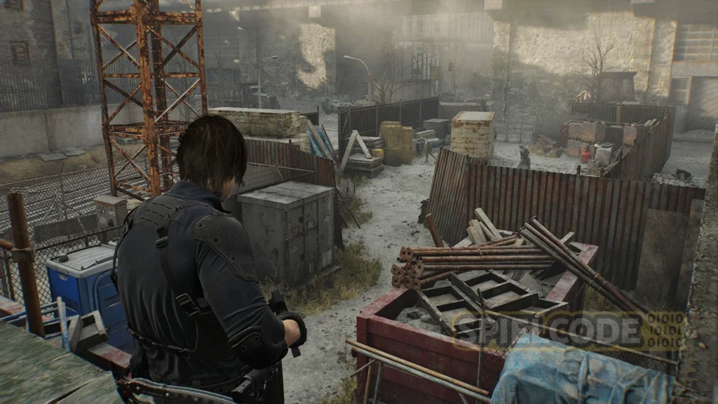 Der BSAA-Container 03: Am besten holst du dir jetzt den optionalen BSAA-Container ganz im Osten auf der langen Straße. Der Weg ist frei. Hier liegt die Marksman 1A. Du brauchst also etwas Platz im Inventar. Um den Container zu erreichen, musst du einmal um den ganzen Müll herumlaufen und hinten die Leiter auf den Container hinauf nehmen.