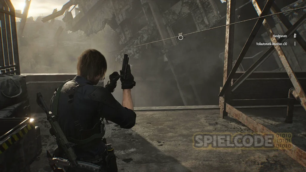 In der östlichen Ecke siehst du ein eher orangenes Objekt. Hier musst du den Boden abschießen, um einen Vorsprung zu errichten. Ich rate dir, bei den Zombies auf dem Dach einfach durchzurennen, bis du am Ende eine Tür siehst, die du aufsperren musst.