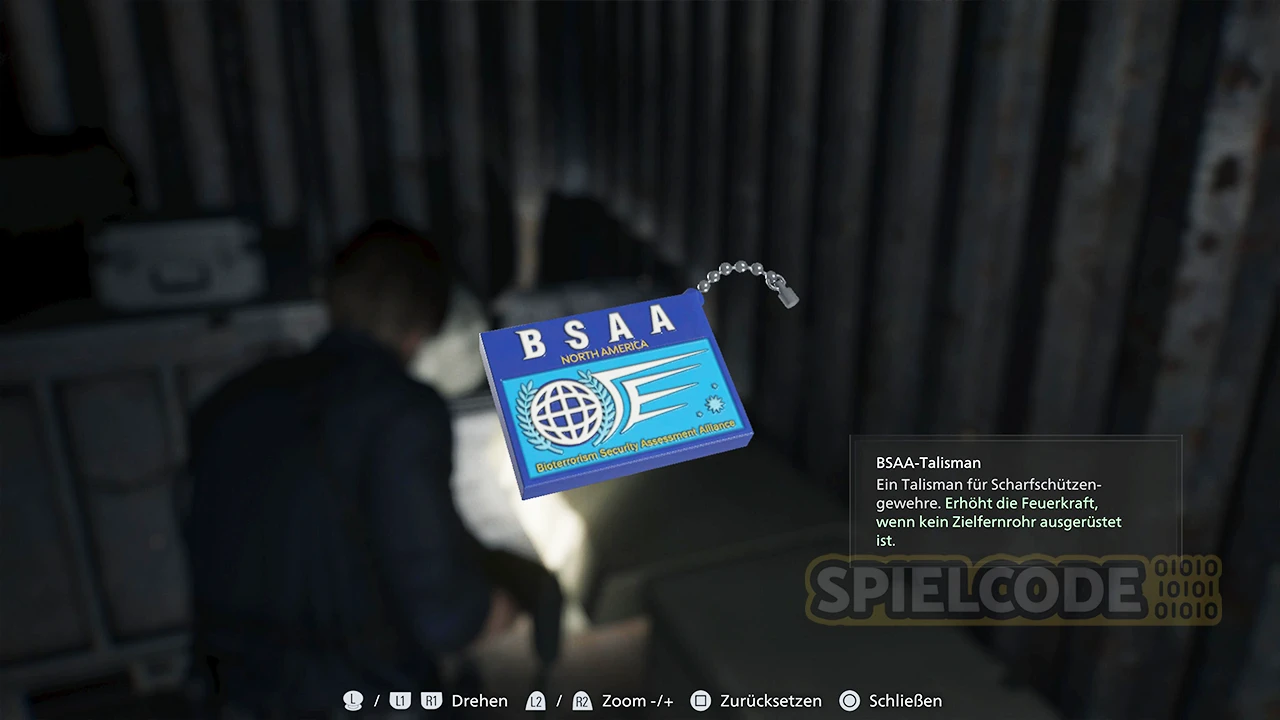 Verlasse den Bahnhof nördlich und laufe zum BSAA-Container 04 vor dem Hotel Applegate. Hier liegt de BSAA-Talisman, der deine Scharfschützengewehre verbessert! Obendrein gibt es ein Tracking-Modul (8600).