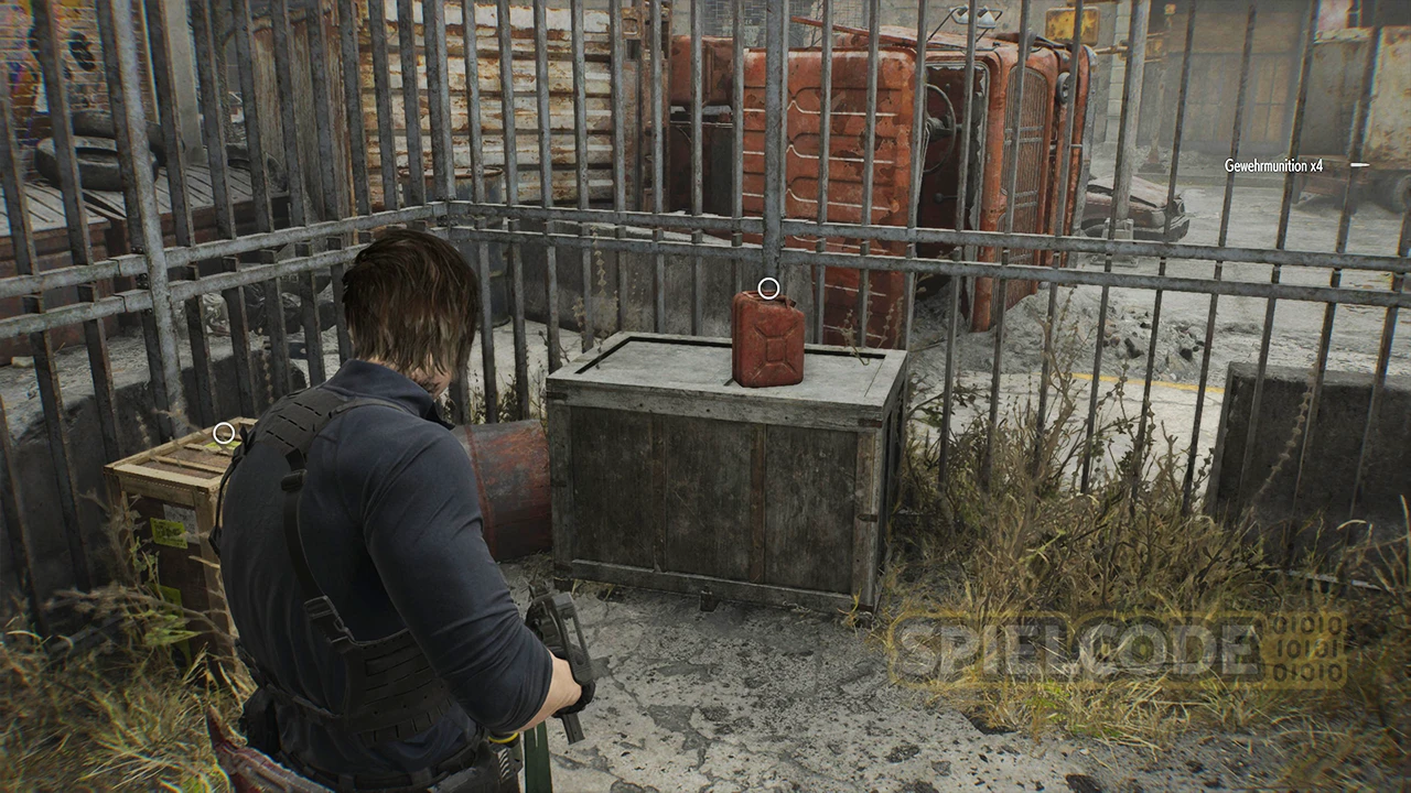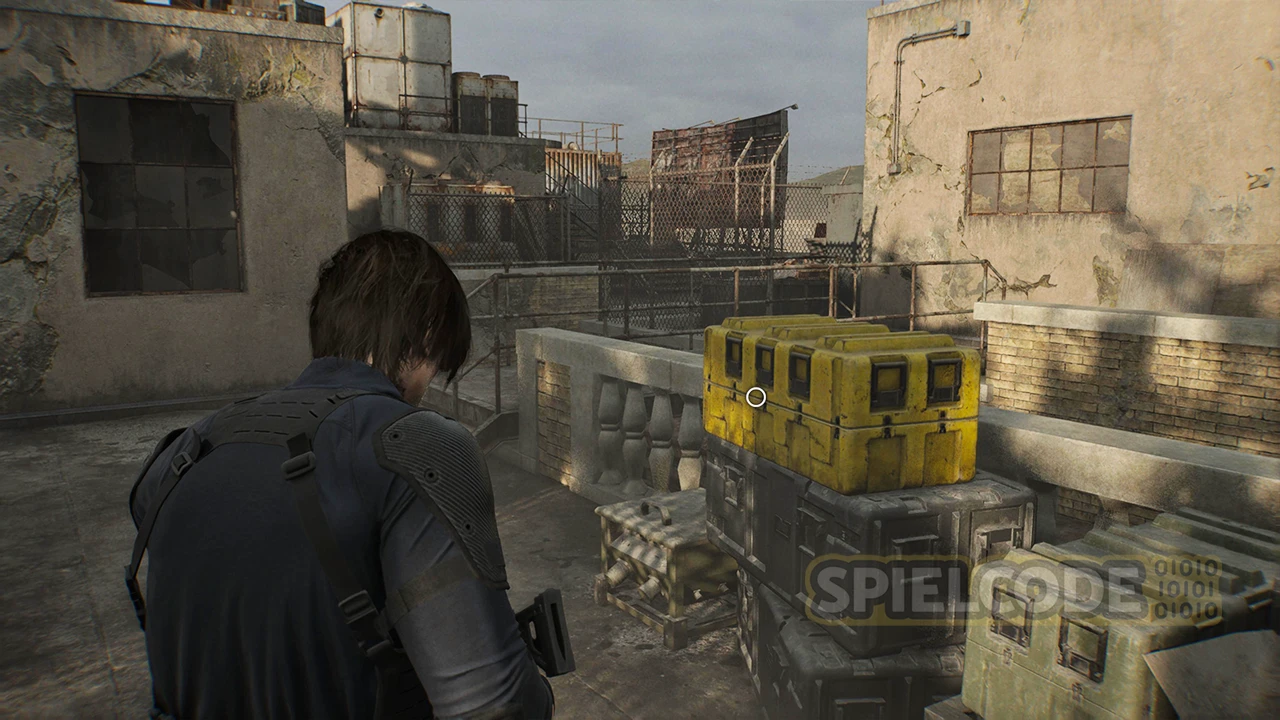 Der BSAA-Container 03: Am besten holst du dir jetzt den optionalen BSAA-Container ganz im Osten auf der langen Straße. Der Weg ist frei. Hier liegt die Marksman 1A. Du brauchst also etwas Platz im Inventar. Um den Container zu erreichen, musst du einmal um den ganzen Müll herumlaufen und hinten die Leiter auf den Container hinauf nehmen.