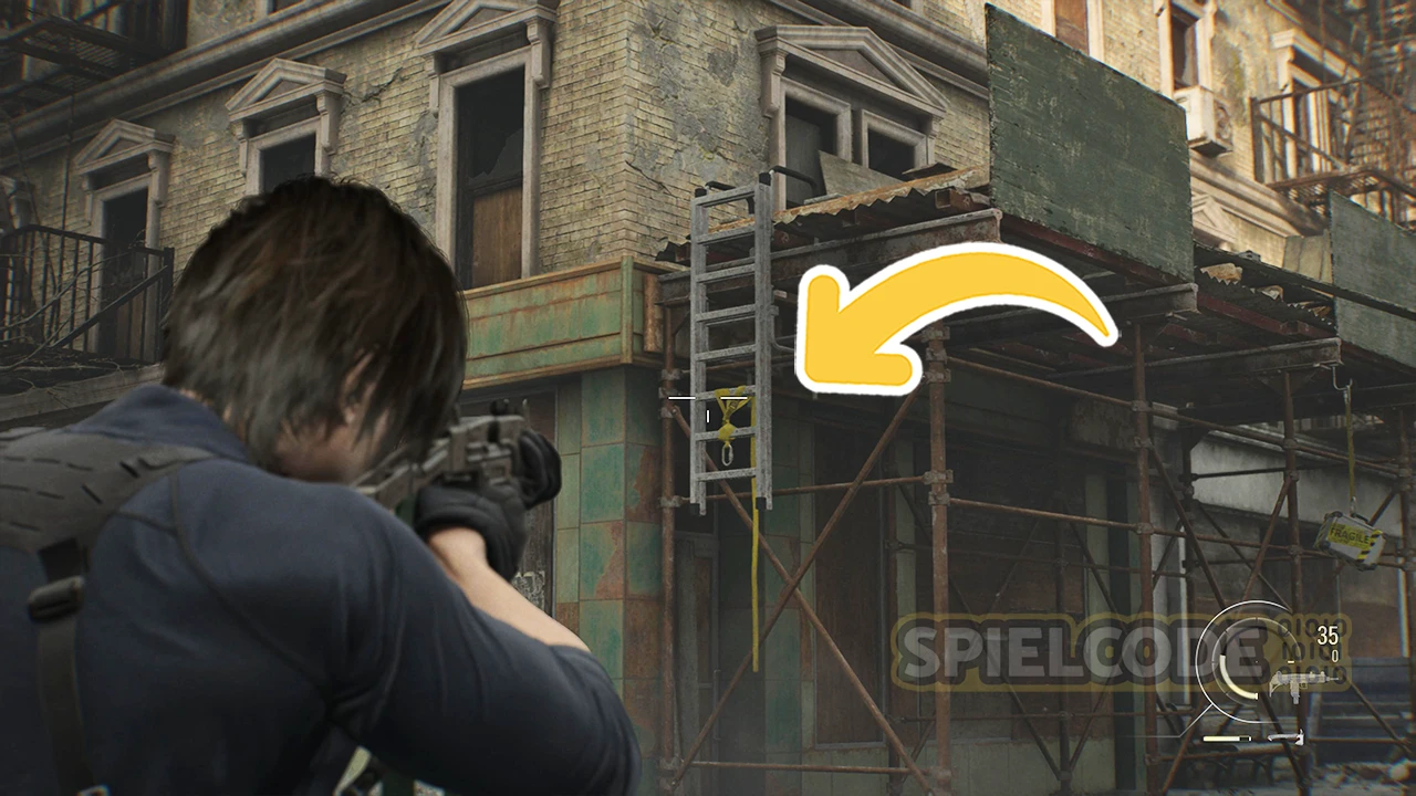 Ein Stück weit nördlich siehst du eine gelbe Leiter zu deiner linken Seite. Oben warten ein paar Vorräte auf dich. Der Weg runter führt über das Rote Gerüst.