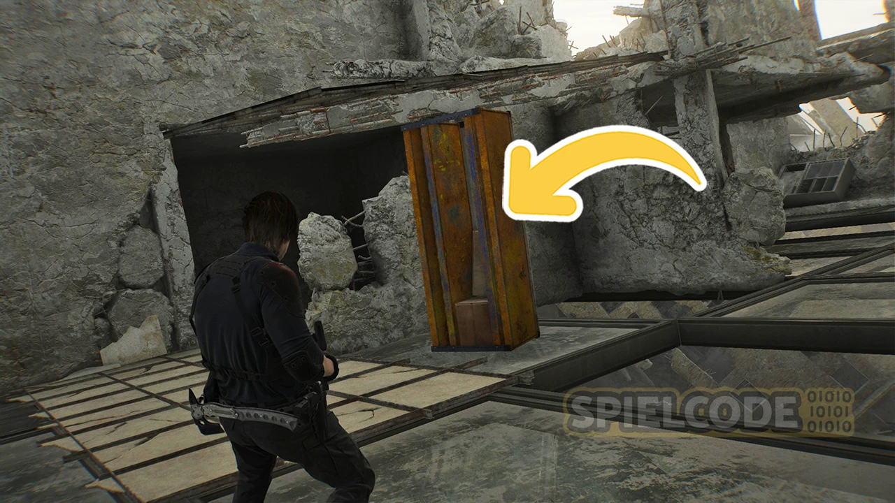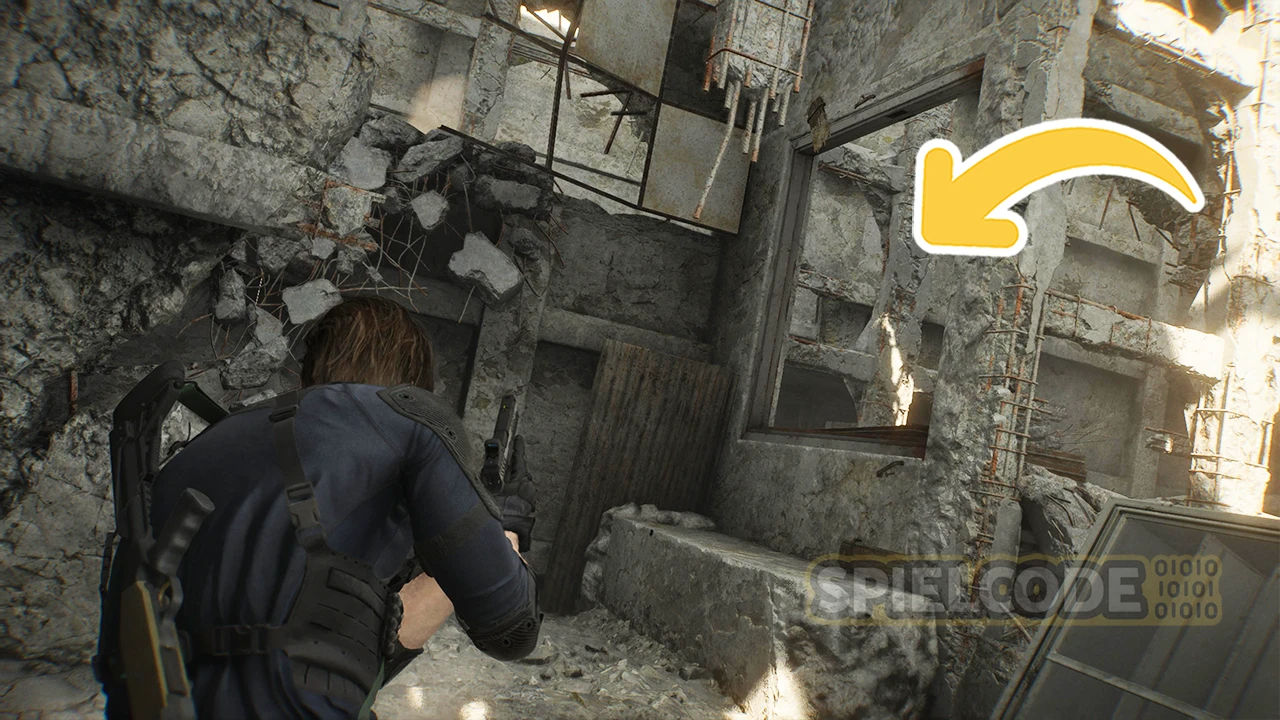 Von hier aus kannst du den Rückweg zum Speicherpunkt wieder öffnen. Und dann läufst du auf dem Dach gen Süden weiter über ein kleines Loch in der Wand.