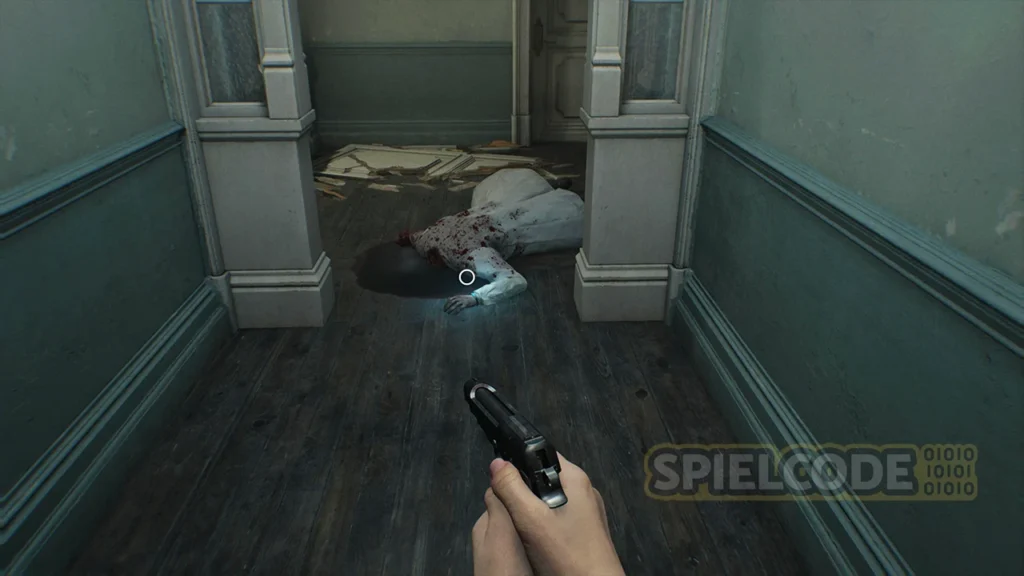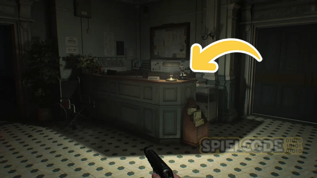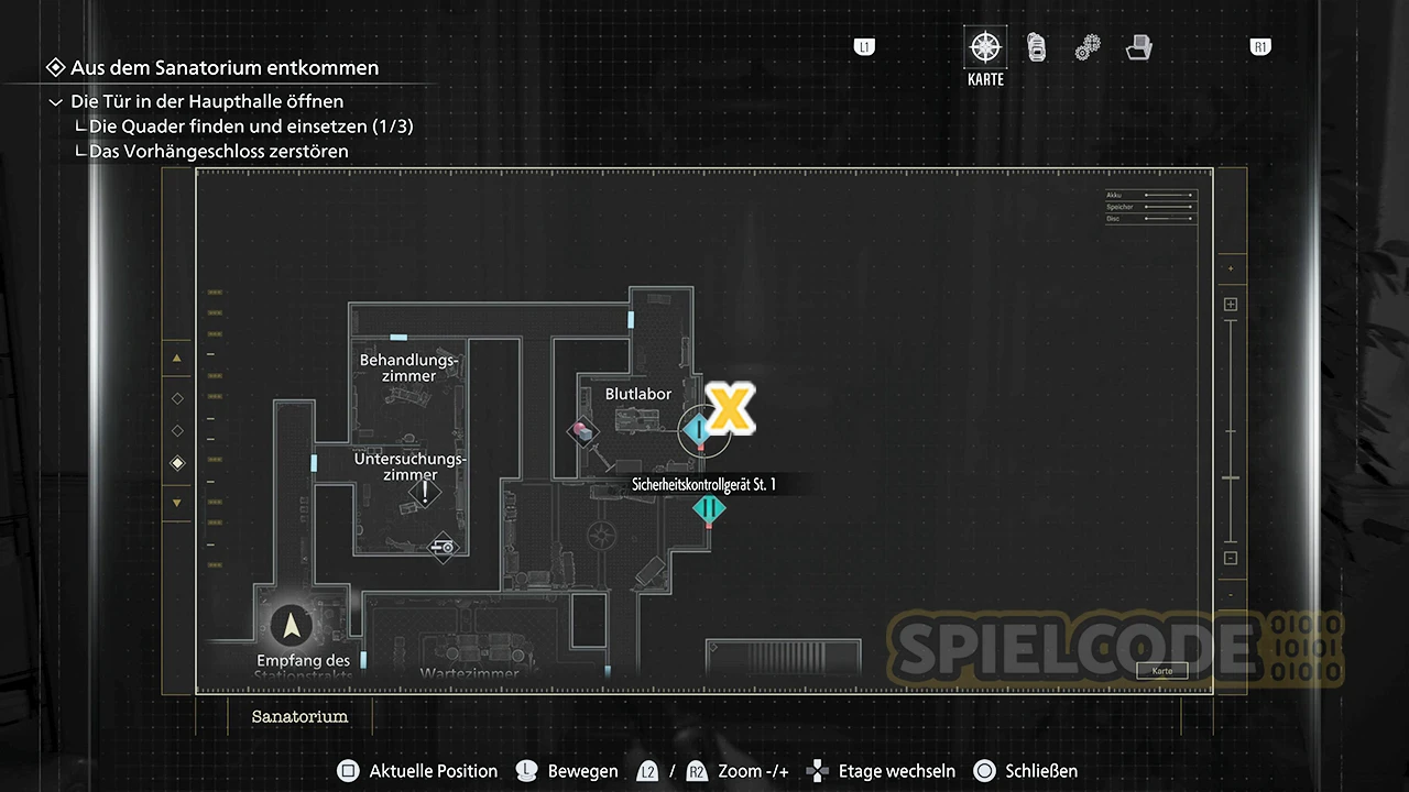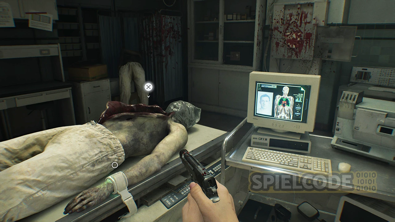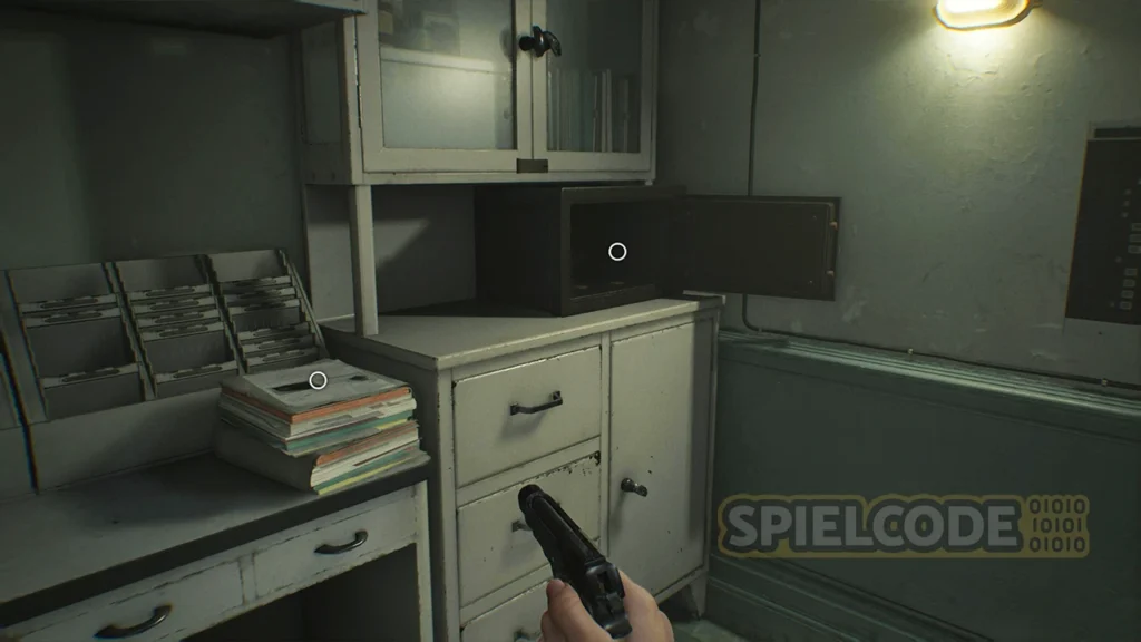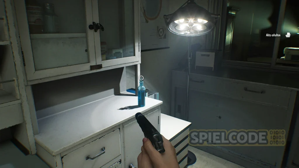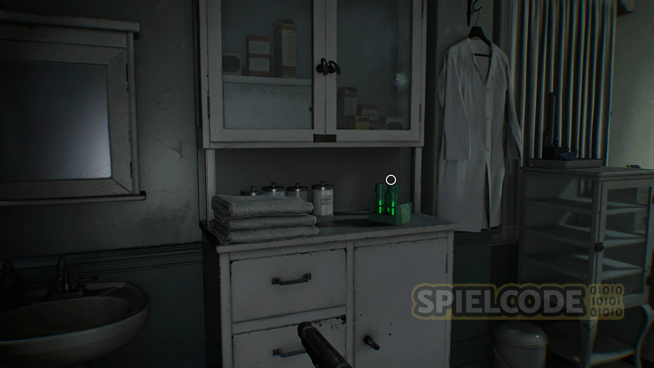 Sammle das Grüne Kraut auf dem dunklen Gang ein und betritt zunächst das Untersuchungszimmer. In der südlichen Ecke findest du einen Tresor, aber wie lautet der Code? Das verrate ich dir später.
