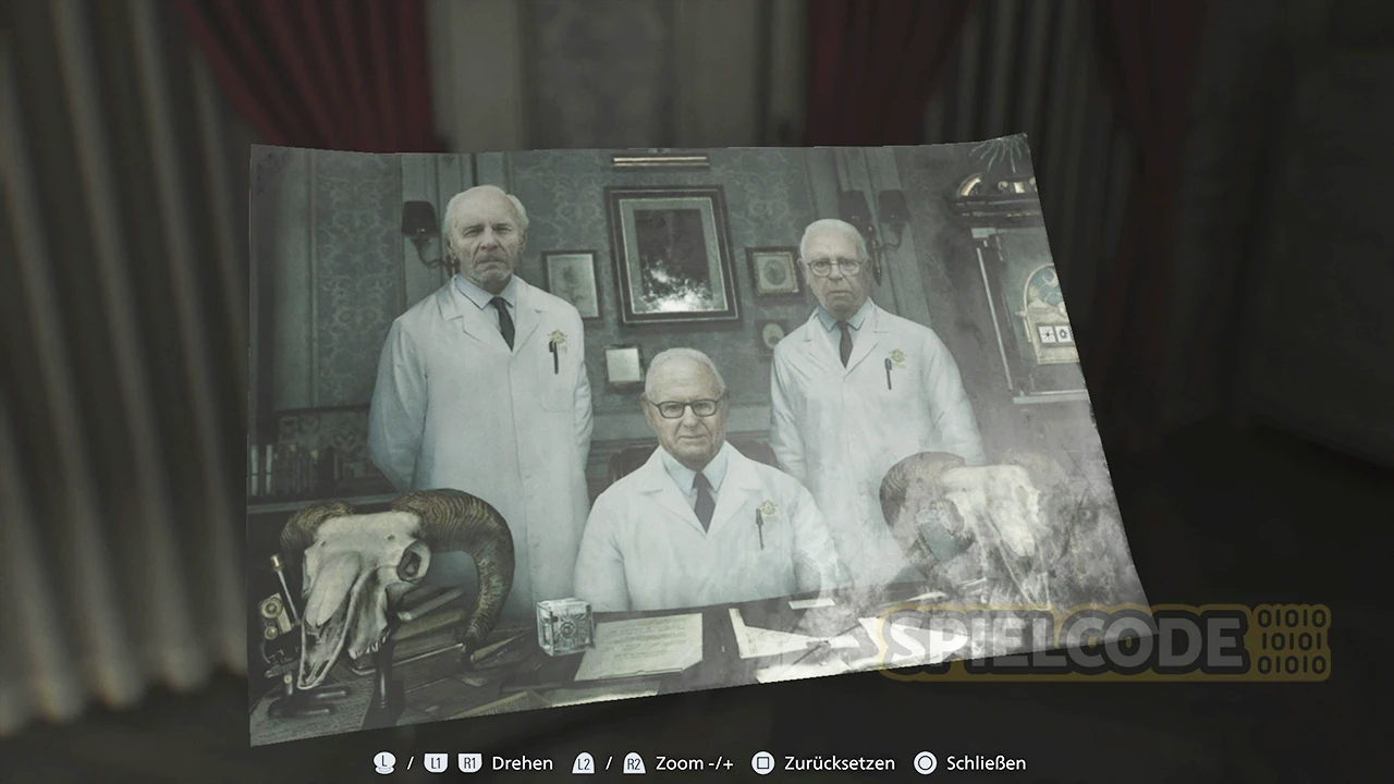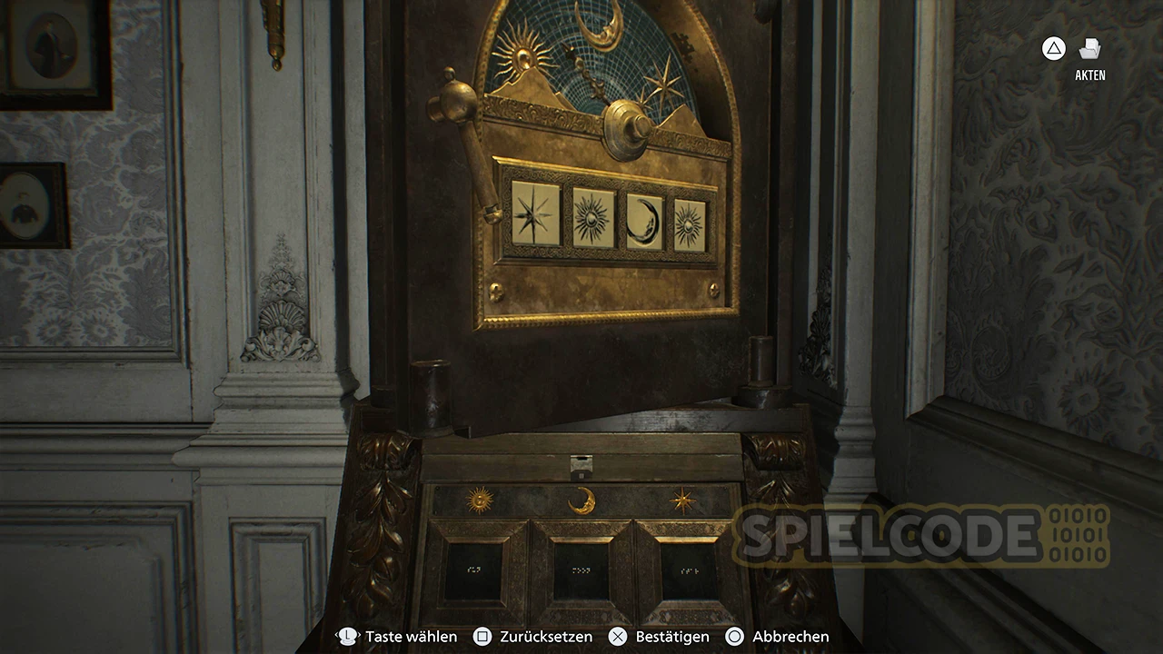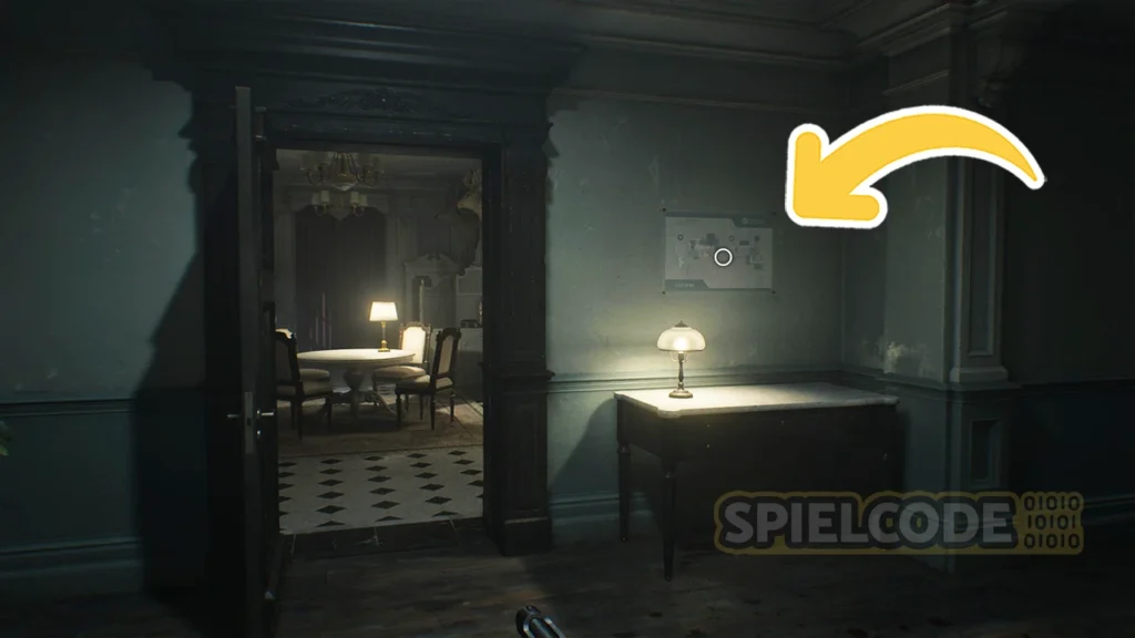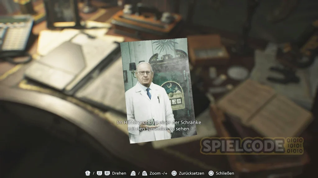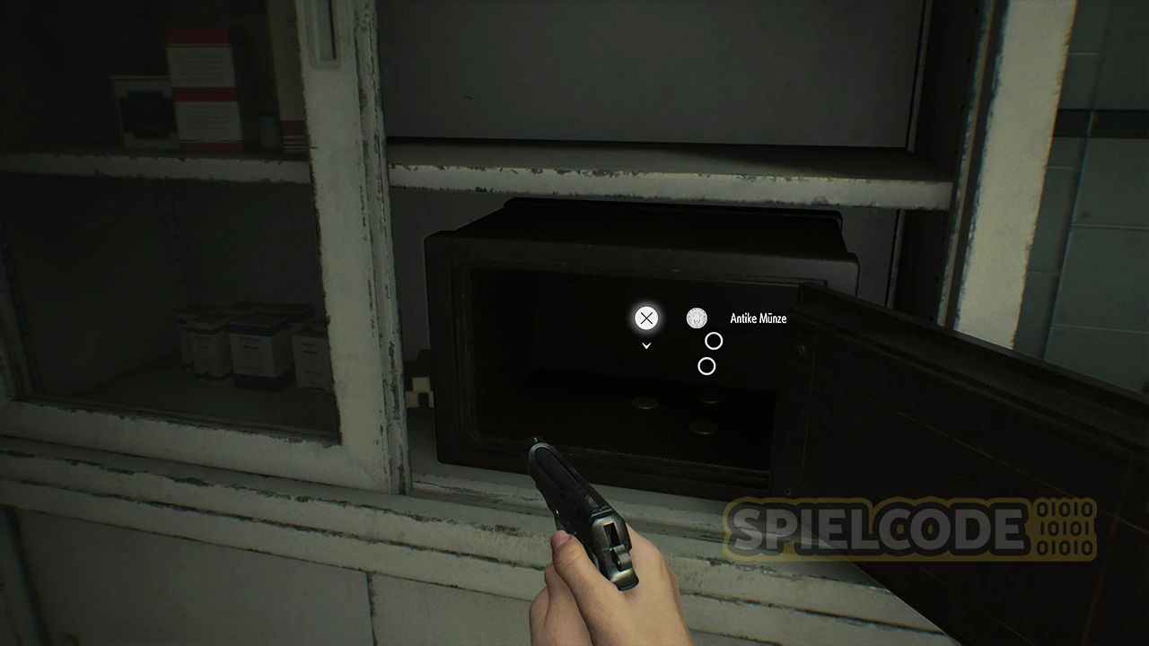Vor dem Raum an sich findest du noch eine sehr wichtige Notiz. Das ist der Hinweis mit den Tresor-Codes für den Tresor im Untersuchungszimmer. Für das Öffnen des Tresors im Untersuchungszimmer gibt es in diesem Fall 3x Antike Münze.