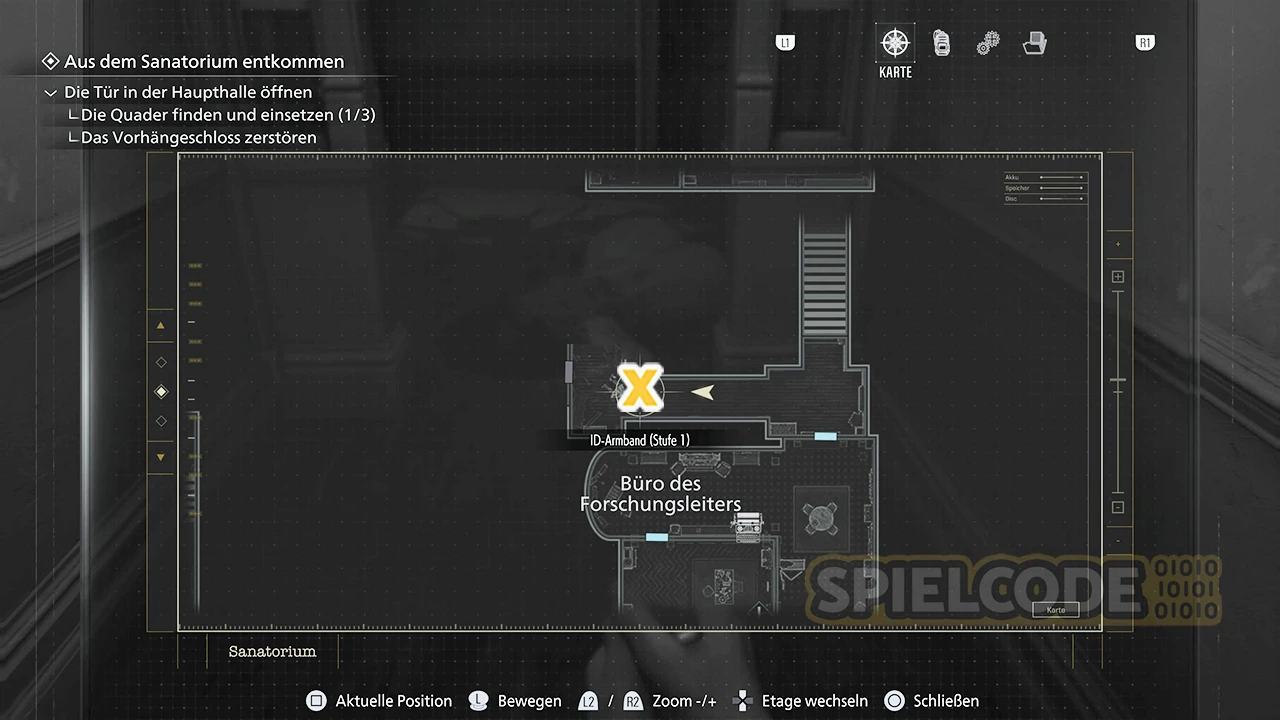 Sammle im Obergeschoss des Ostflügels jetzt das ID-Armband (Stufe 1) im Flur auf.