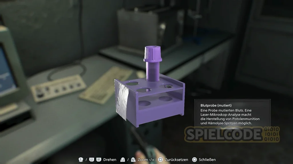 Das infizierte Blut hast du sicher schon gesehen. Es gibt Eimer voller Blut im Spiel, von denen du einen im Blutlabor findest.